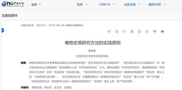 近日,我院院长曹典顺教授的论文《唯物史观研究方法的实践原则》在人文社科领域顶级期刊《中国社会科学》2026年第1期正式发表。